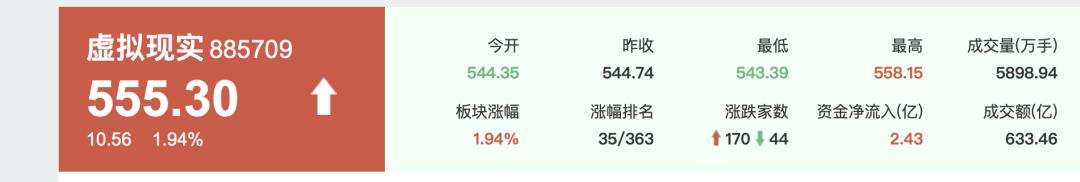 该报告涉及到底层技术、关键器件提供商以及场景解决方案等多类玩家。消息一出,虚拟现实板块连续几天上涨。截至11月7日收盘,虚拟现实板块整体涨1.94%,跑赢上证指数(涨0.23%),虚拟现实板块下有170家概念股股价上涨。