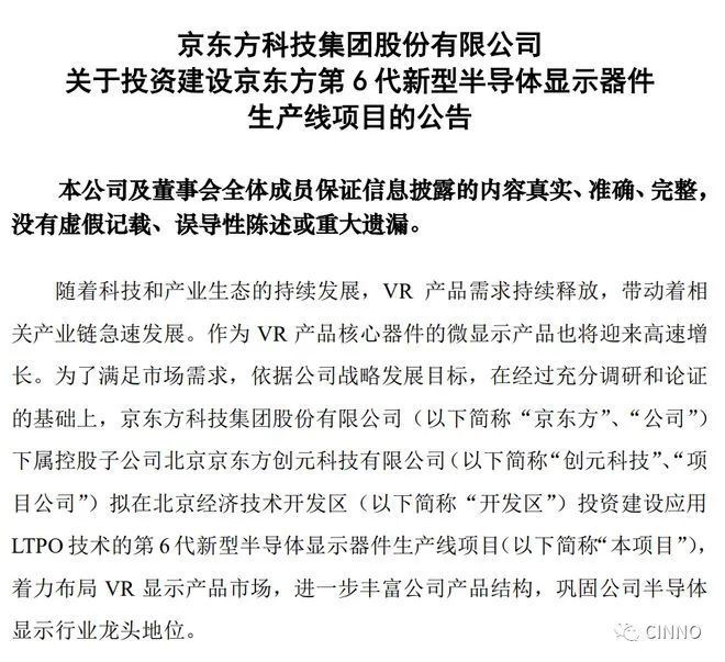 10月30日,京东方发布《关于投资建设京东方第6代新型半导体显示器件生产线项目的公告》,提到将加速VR产品核心零器件投产,投资用于VR的显示面板和MiniLED等高端显示面板。