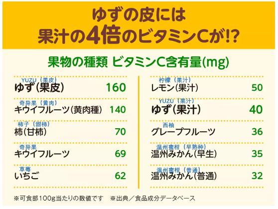 日本柚子皮内侧的白色棉质和脉络部分中,含有很多被称为柚皮苷的物质,其含量约是橘子的20倍、柠檬的3倍。作为多酚的一种,柚皮苷具有强化血管、防止水肿、改善血液循环的作用,可以改善肩膀酸痛和体寒,除此之外,还有改善高血压、降低中性脂肪和胆固醇的作用,在日本,冬至泡柚子浴或柚子温泉的习俗始于江户时代,据说泡一次柚子温泉这一年都不会感冒,因而常作为主要成分被添加进各种入浴剂。