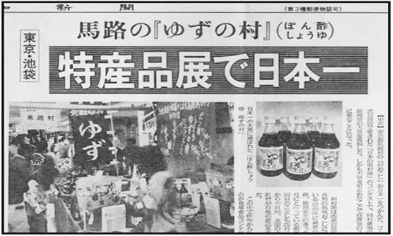 1986年,随着加入柑橘果汁的酱油调味料成为日本全国餐桌的必备调味品后,马路村也推出了旗下首款产品:柚子醋酱油“柚子之村”,与市面上产品的差异性在于,“柚子之村”大量使用了当地产的柚子,柚香浓郁,并且还添加了由鲣鱼和海带混合而成的高汤来提高鲜度,不使用化学调味料,酸度柔和,味道醇厚均衡,因而深受消费者的喜爱。并且还在1988年日本百货巨头西武百货举办的「日本的101村展」中获得特产品的金奖。