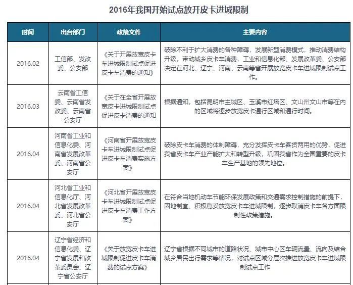 2016年,长达22年的皮卡禁令开始松动,这一年,工信部、发改委、公安部联合发布了《关于开展放宽皮卡车进城限制试点 促进皮卡消费的通知》,并以河北、辽宁、河南、云南四个省份作为试点省份,率先放宽皮卡进城的限制。