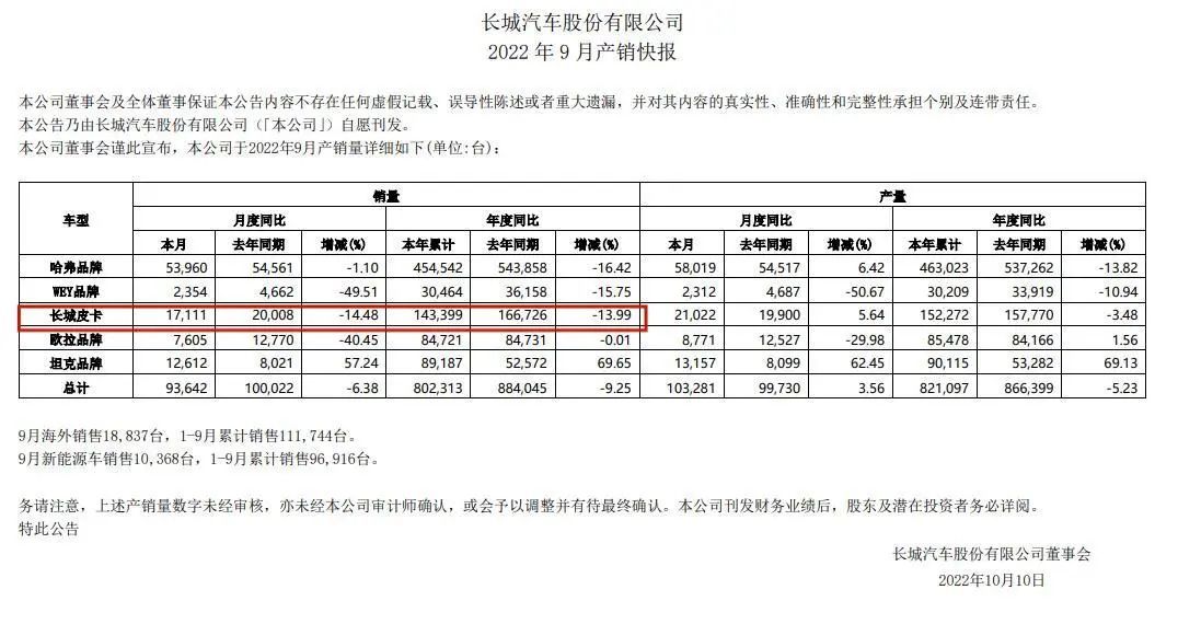 长城也正在遭遇围剿。一个危险的信号是,2022年1-9月,长城皮卡销量同比下滑14%。