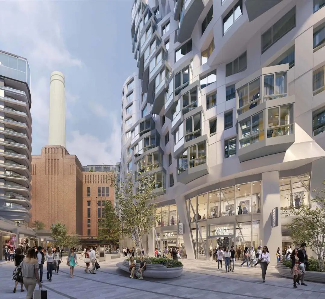 砖红色建筑主要为商业空间,后方和右侧的不规则形状建筑为住宅. 图片来自:巴特西发电站官网