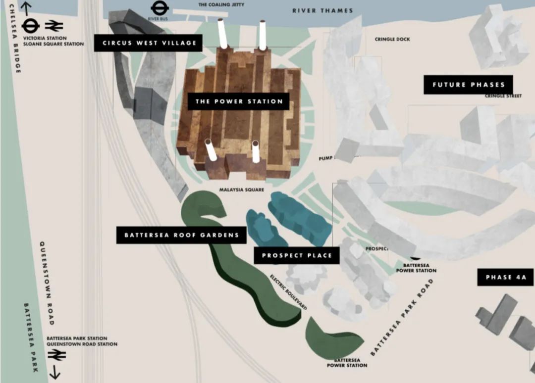 最终,巴特西发电站被马来西亚 SP Setia(实达集团)和 Sime Darby(森那美集团)于 2012 年共同出资买下,又过了 6 年到了 2018 年,才被马来西亚国民投资公司(PNB)和马来西亚雇员公积金局(EPF)收购,规划把商户、写字楼、公寓、开放空间、绿地和艺术空间融为一体。