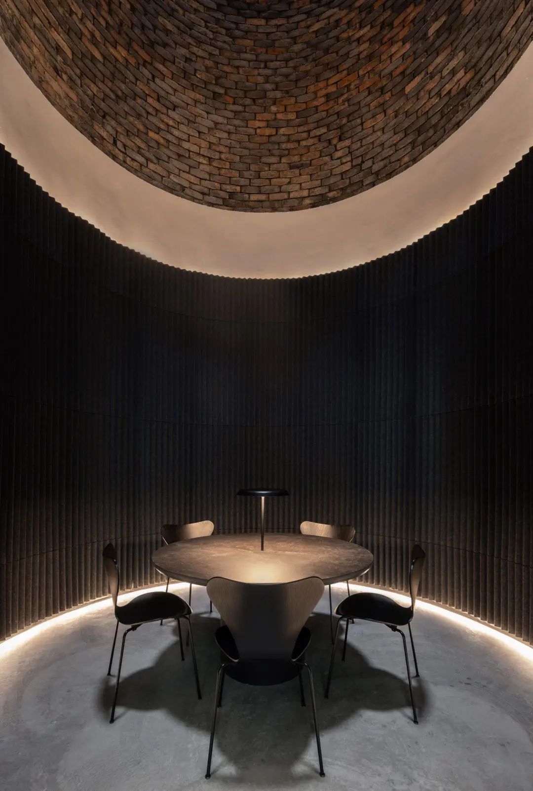 深色石头、木材和金属的简单调色板与裸露的结构形成鲜明对比,发电站其中一个砖烟囱底部设计成了一间大气古朴的会议室。