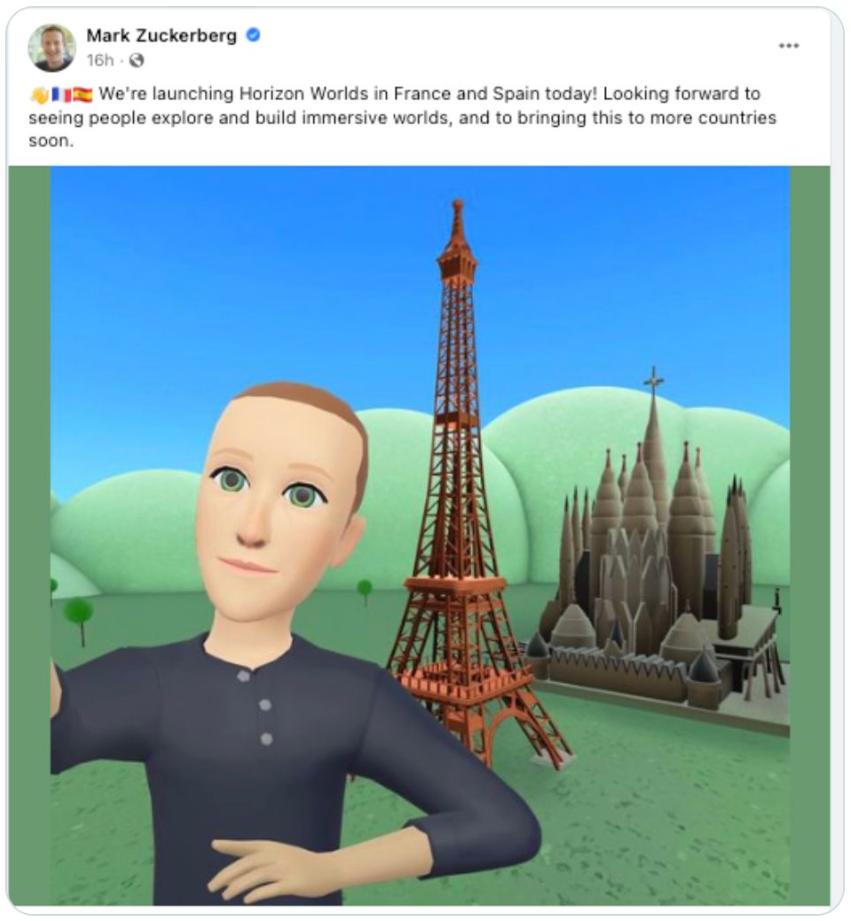 今年8月,扎克伯格在社交媒体,上传了自家元宇宙平台Horizon Worlds里的化身自拍截图,庆祝该平台在法国和西班牙的上线。