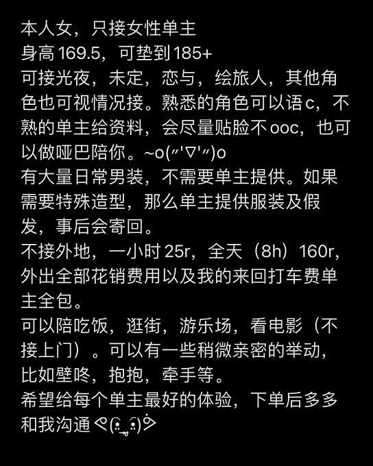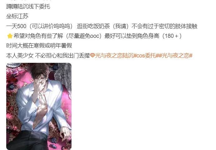 与过去的陪玩、哄睡等情感消费相比,线下委托因为有二次元人物原型,所以单主有更明确的要求与指向。她们提出的不再是声音好听、温柔、风趣这类宽泛而模糊的标准,而是直接指定“希望熟悉角色本身包括语癖及梗、不要OOC”。有些单主还会对委托对象的身高提出具体要求,比如“尽量垫到185”等。