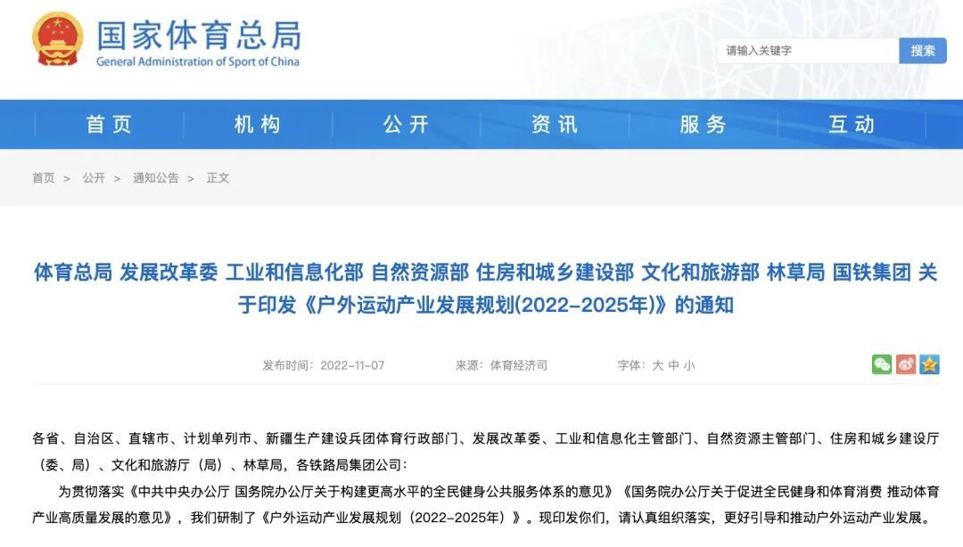 11月7日,国家体育总局联合发展改革委等八部门联合印发《户外运动产业发展规划(2022-2025年)》。