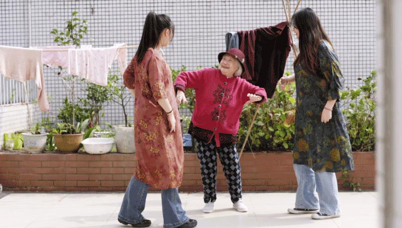 午饭后,两个00后工作人员在阳台上和婆婆跳起了舞。有趣的是,她们身上穿的不是工作服,而是拿自己的衣服跟婆婆互换的碎花裙,在阳光下快活得像两只翩翩的蝴蝶。