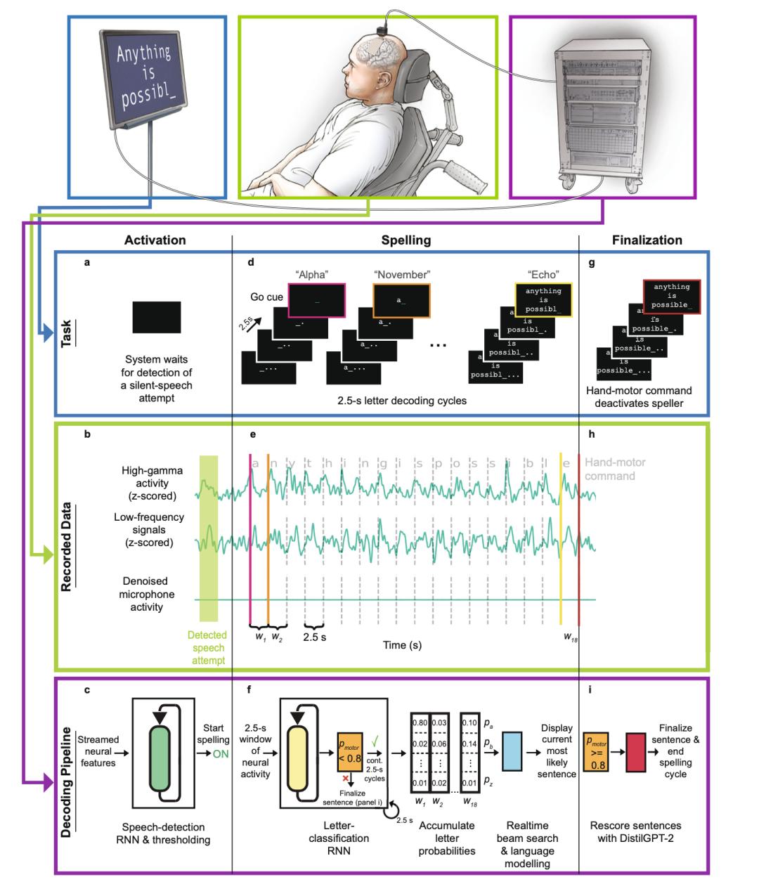 在句子拼写试验开始时,参与者试图默念一个单词来主动激活拼写器(图 a),在整个任务过程中,新系统从电极记录的皮层数据中实时提取神经特征(高伽马活动和低频信号),麦克风信号表明在执行任务期间没有声音输出(图 b)。