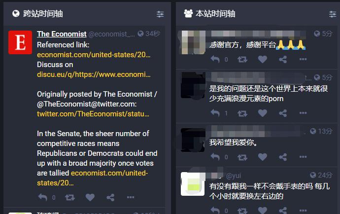 一种类似于 Tweetdeck 式的长毛象用户高级界面,可以同时查看本服务器 (local timeline) 和跨服务器时间线 (federated timeline)。用户也可选择默认的单一时间线界面。图片来源:硅星人