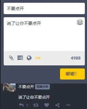 加入内容警告按钮的编辑器界面,以及嘟文的效果图片来源:某第三方服务器