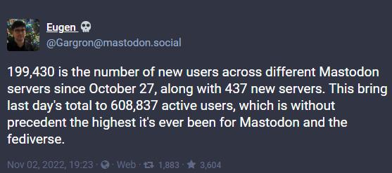 很显然,马斯克对 Twitter 的接管和“滥用”所导致的用户流出效应,是长毛象平台的数据暴增的一个最直接原因。