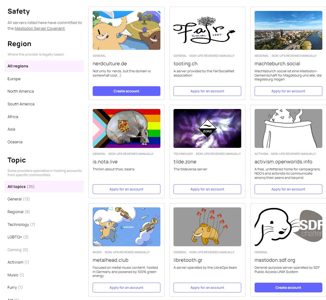 一些长毛象服务器,有的可以直接注册,有的因人多或有特殊规则,需要向管理员申请,通过后才可注册。图片 来源: joinmastodon.org