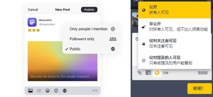 两个不同平台的嘟文可见性和字数限制示范图片来源:joinmastodon.org、某第三方服务器