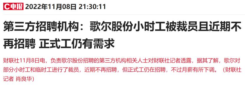 负责歌尔股份招聘的第三方机构相关人士最新对财联社记者透露,据其了解,歌尔对部分小时工和临时工进行了裁员,近期不再招聘,但正式工仍在招聘,不过月薪有所下调。