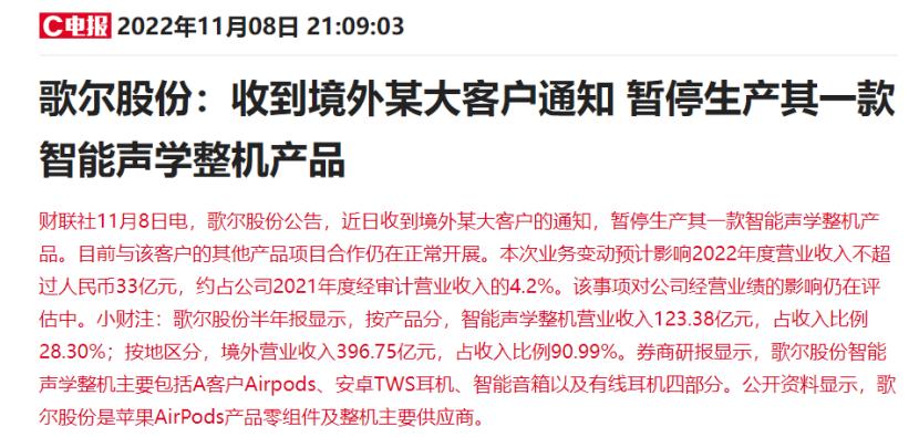 总市值近800亿元的苹果产业链龙头歌尔股份昨日晚间公告,近日收到境外某大客户的通知,暂停生产其一款智能声学整机产品。目前与该客户的其他产品项目合作仍在正常开展。本次业务变动预计影响2022年度营业收入不超过人民币33亿元,约占公司2021年度经审计营业收入的4.2%。该事项对公司经营业绩的影响仍在评估中。