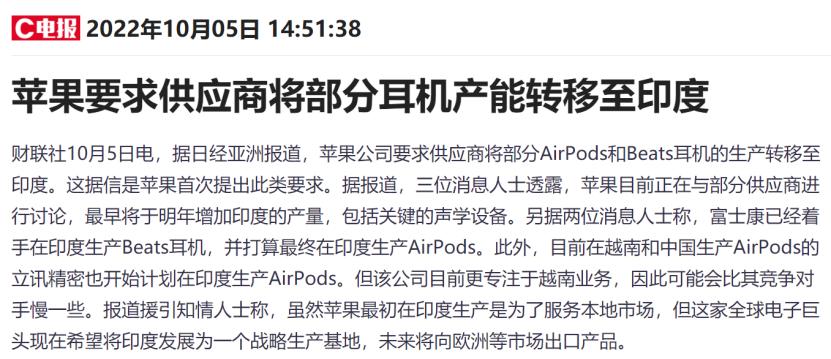 据日经亚洲近期报道,苹果公司要求供应商将部分Air Pods和Beats耳机的生产转移至印度,据悉这是苹果首次提出此类要求。目前在越南和中国生产Air Pods的立讯精密也开始计划在印度生产Air Pods。