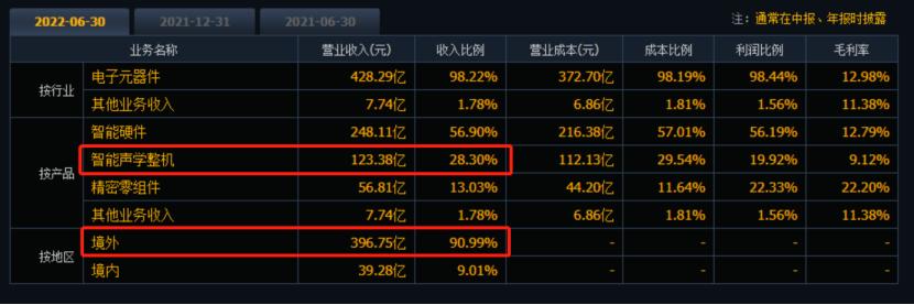 公开资料显示,歌尔股份上半年智能声学整机业务营收123.38亿元,占比近三成。按地区分,境外营业收入396.75亿元,占比超9成。光大证券分析师刘凯等人10月11日发布的研报指出,歌尔股份智能声学整机主要包括A客户Air pods、安卓TWS耳机、智能音箱以及有线耳机四部分。