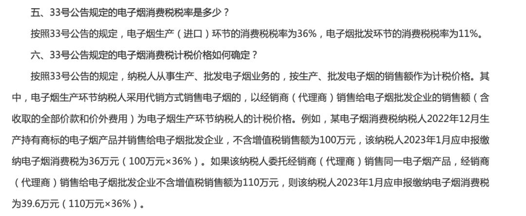 自11月起,《关于对电子烟征收消费税的公告》将正式实施,将电子烟纳入消费税征收范围,生产(进口)环节的税率为36%,批发环节的税率为11%。《公告》明确,纳税人生产、批发电子烟的,按照生产、批发电子烟的销售额计算纳税。