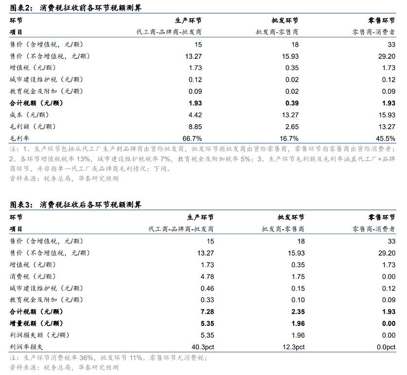 华泰研究以思摩尔国际代工的主流品牌烟弹为例进行了测算,假设生产环节出货价(品牌商出货给批发商)15元/颗,批发环节出货价(批发商出货给零售商)18元/颗,零售环节出货价33元/颗;再假设消费税征收后各环节均不涨价,消费税征收前,生产环节电子烟需缴纳的税款只有1.93元/颗,消费税征收后则达到7.28元/颗。也就是说,生产环节将多收5.35元/颗的税,盈利受损较大,导致利润率损失约40.3%。