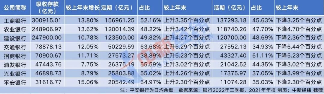 从8家银行披露的数据可以看出,各家银行的定期存款占比均较上年末有所上升,与此同时,活期存款占比均较上年末有所下降。