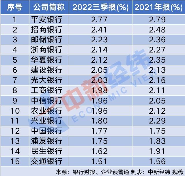 同时由于今年贷款利率下行,银行净息差也出现收窄。根据六大国有行和9家A股上市股份行披露的数据,截至2022年9月末,15家银行中,仅中国银行的净息差较上年末小幅上升了0.02个百分点,其余14家净息差均较上年末有所下降。