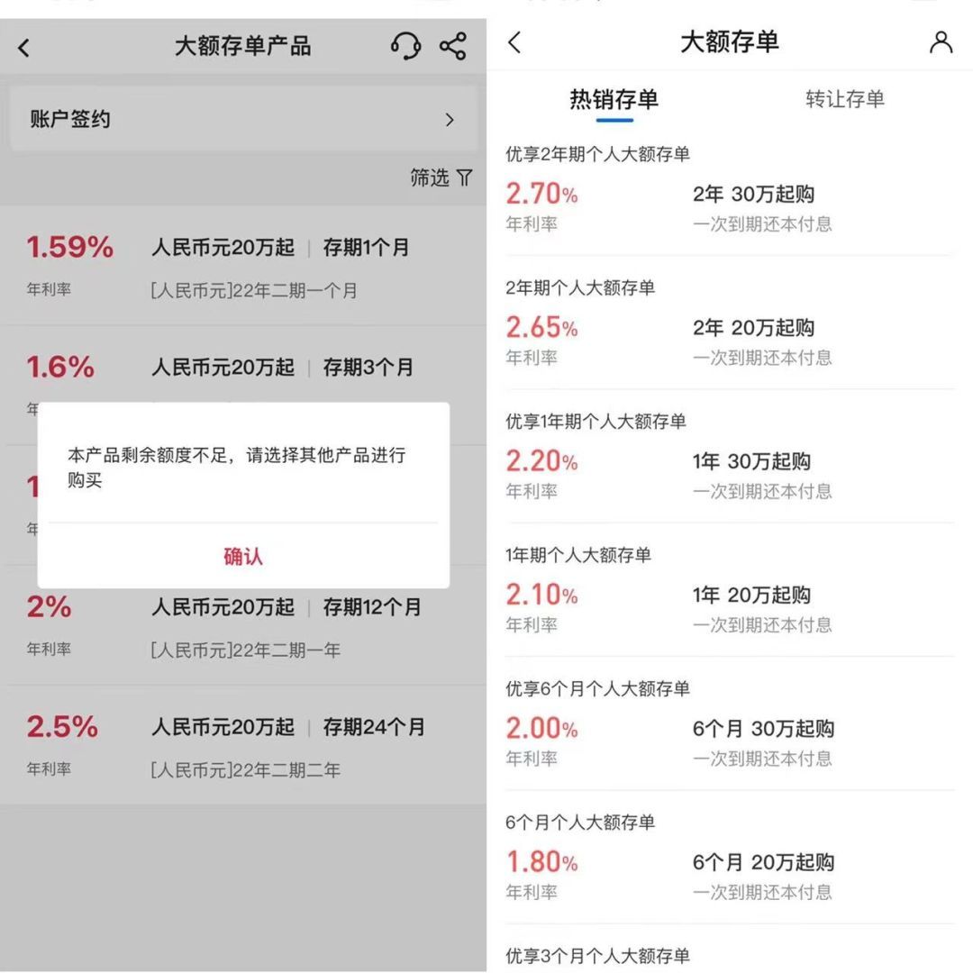 家住北京西城区的张女士最近想存一笔钱,当打开建设银行手机APP查询时,她简直不敢相信自己的眼睛,页面显示“暂无可购买的大额存单”。“怎么没有大额存单了?”她赶忙拨打了网点电话询问,工作人员告知她,额度有限,卖完就没了。