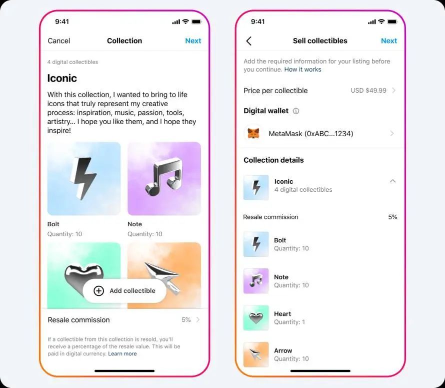 粉丝们则可以直接在 Instagram 中购买 NFT,走传统的应用内购买路线,即用信用卡或借记卡购买,再将 NFT 存入数字钱包,所以仍需缴纳应用商店费用,包括备受争议的 30%「苹果税」。