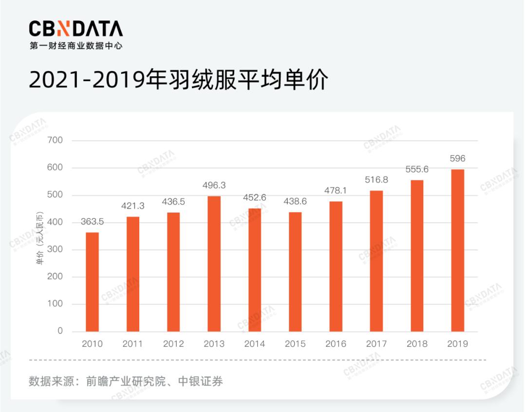 近10年来,羽绒服价格涨势惊人,2010-2019年间羽绒服均价上涨近64%,尤其是在2016-2019年间,羽绒服均价每年都有7-9%的上涨。