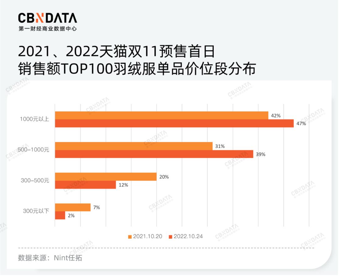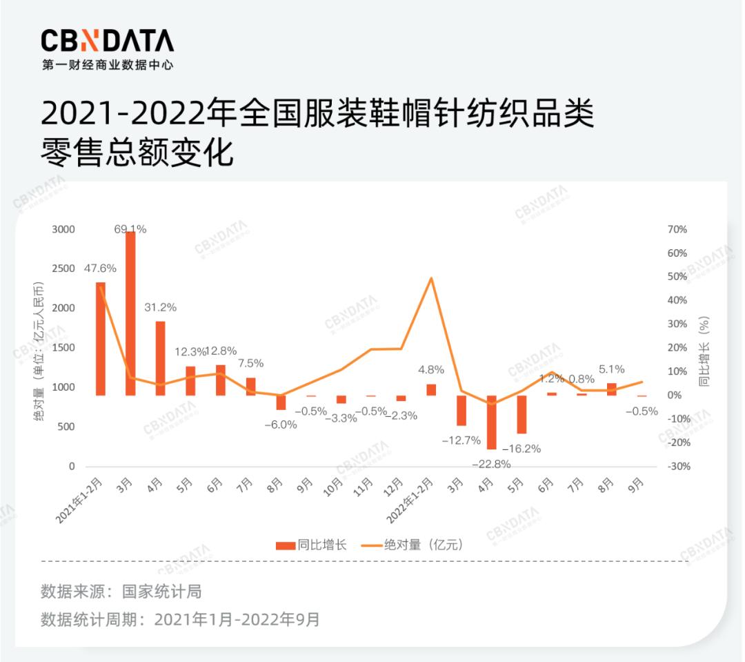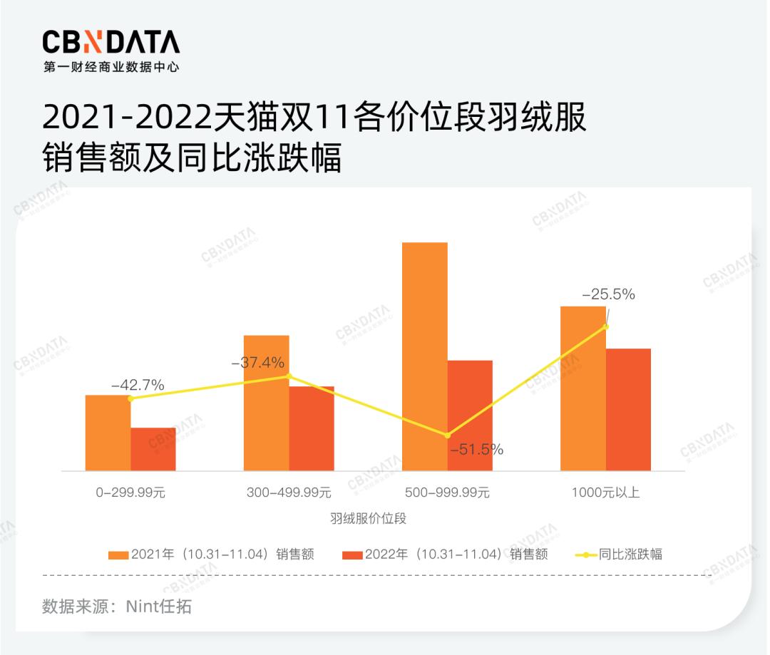 从消费端而言,相对更高的价格,意味着更优的产品品质。尤其是在疫情反复影响经济预期的背景之下,服装鞋包作为非必要消费之一,预算遭到削减——国家统计局数据显示,今年1-9月服装、鞋帽、针纺织品类的零售总额同比减少4%,分月来看,服装行业几乎每个月的销售增长情况均相当疲软。那么,在有限的预算范围内选购品质更好更耐用的产品,成为更多消费者的选择。这也是为什么今年双11羽绒服销售额整体下降,而高价位产品销量却有所拉升的原因所在。