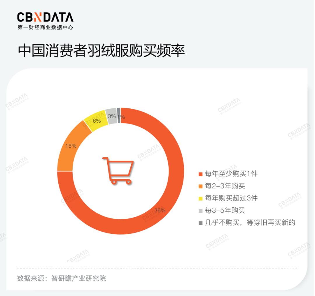 鸭鸭是“反季促销”行列中的佼佼者——“抖衣”数据显示,鸭鸭凭借39.74%的市占率,成为抖音平台今年6月反季销售的羽绒服品牌中当之无愧的TOP1。消费者的羽绒服需求量是恒定的,智研瞻产业研究院相关调研数据显示,尽管消费者的羽绒服购买频率有所提升,“每年至少购买一件羽绒服”的消费者占比高达75%,但仍有近20%的消费者每2-3年甚至3-5年购买羽绒服,一年内购买2-3次羽绒服的消费意愿并不高。对于单个品牌来说,抢在其他品牌之先,在夏天尽可能“收割”消费者的羽绒服需求,让其他品牌“无路可走”,或许是一个思路。