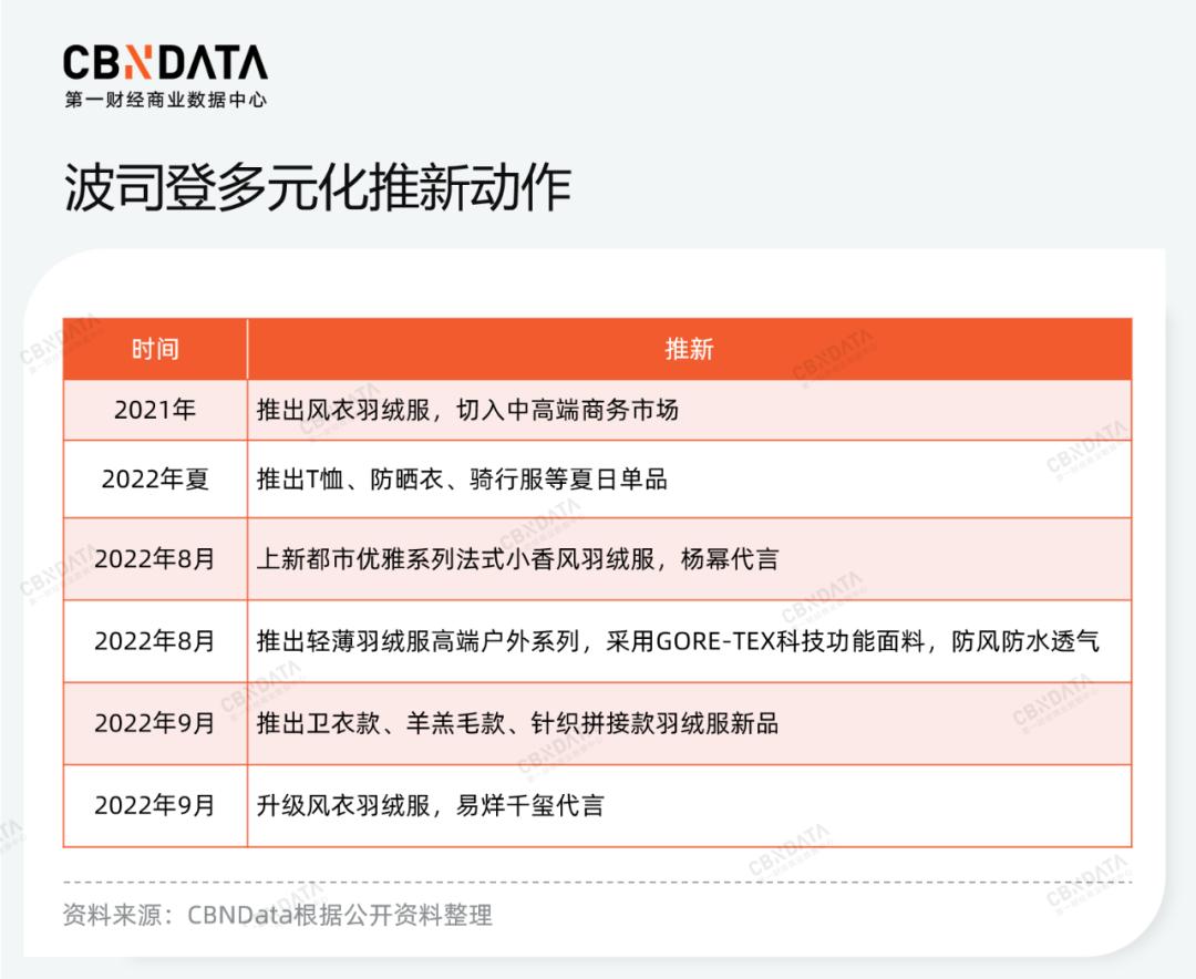 2018年,波司登提出“聚焦主航道,聚焦主品牌,收缩多元化”的新目标,凭借中高端定位和时尚化设计路线重回消费舞台。尽管“多元化”有所收缩,但这一战略并没有被波司登放弃,这从近两年来波司登的推新动作中就能发现。