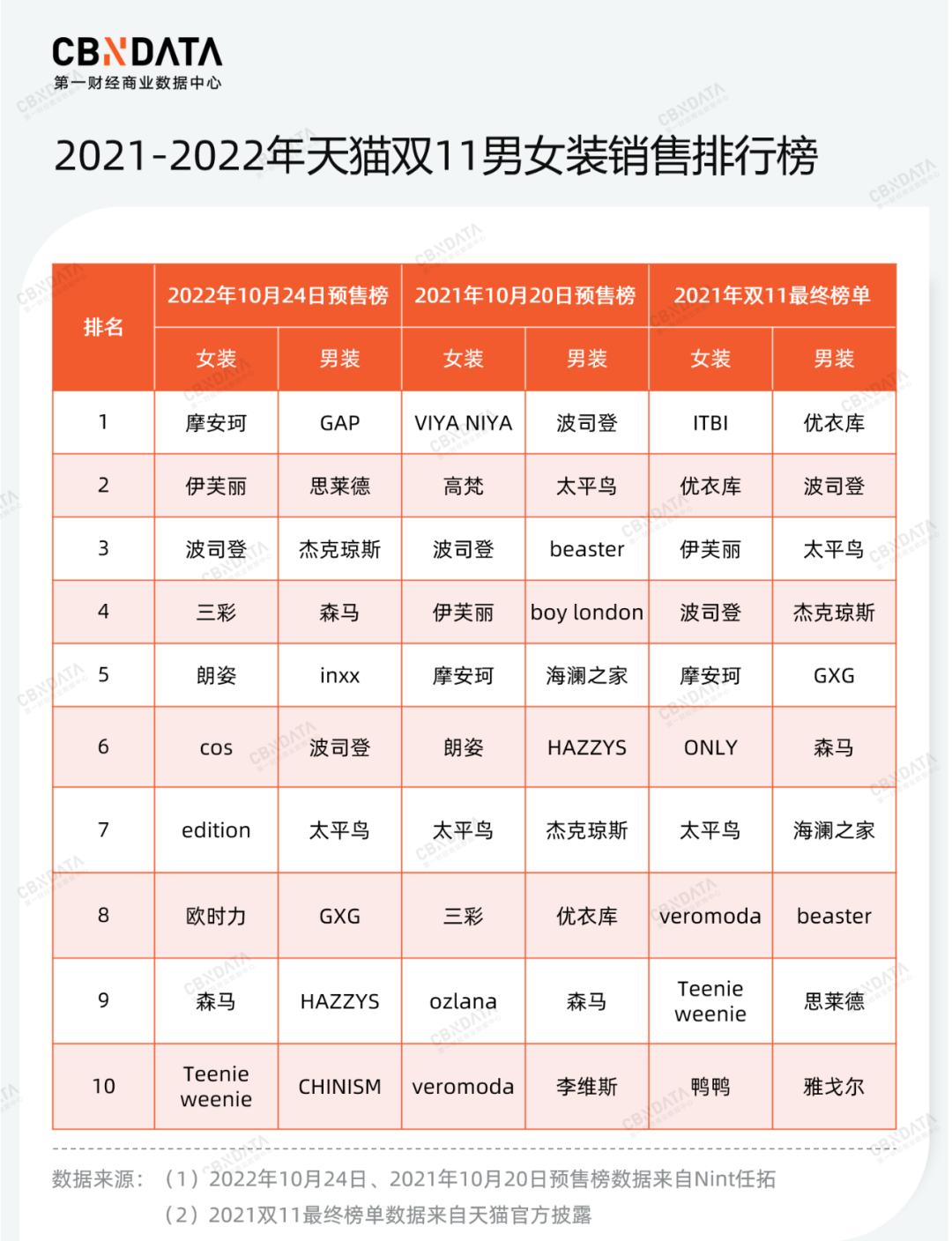 从品牌来看,VIYA NIYA、ITBT、beaster等去年表现突出的红人品牌、国潮品牌纷纷“消失”在预售TOP榜。与“消失”的品牌形成对比,羽绒服品牌波司登在男、女装品类均稳居TOP10席位。