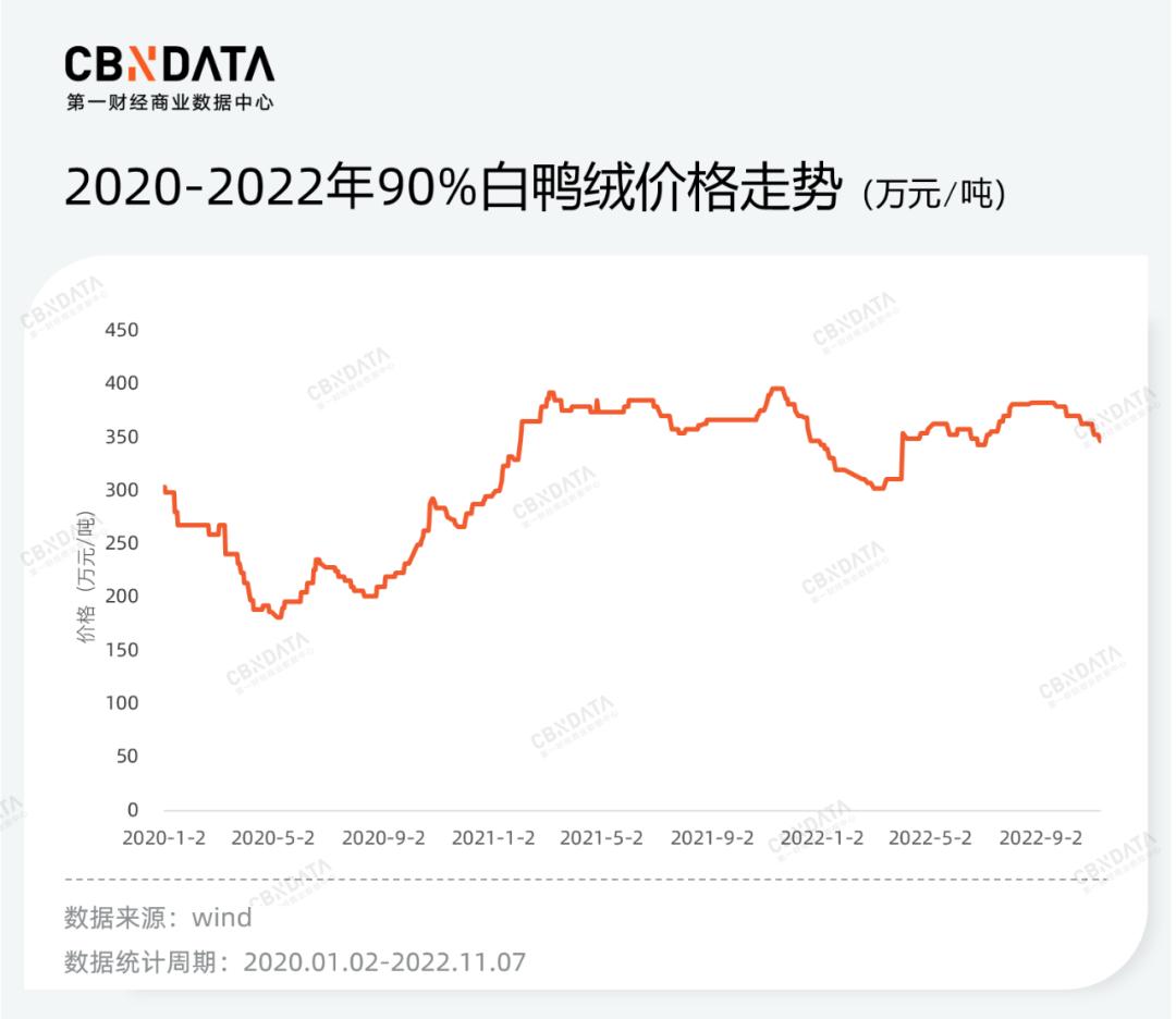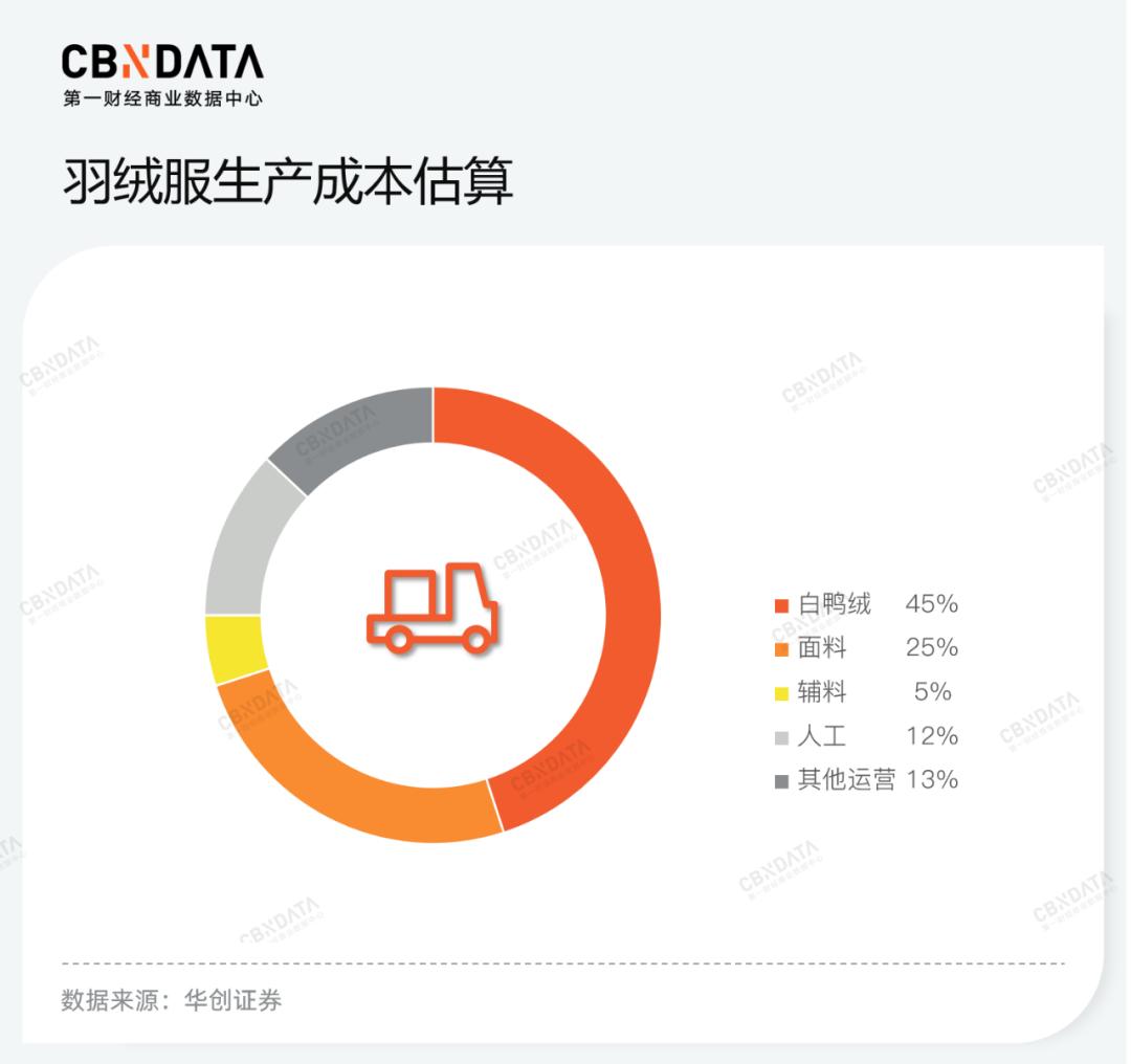 白鸭绒占羽绒服生产成本的比例高达45%,而在疫情发生以来,白鸭绒原料的价格持续走高。wind数据显示,2020年疫情发生以来,90%白鸭绒的最高单单价与最低单价的差值达到1.18倍。