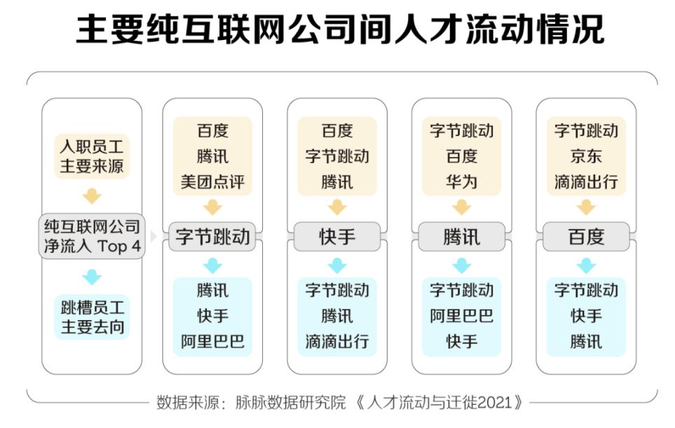 互联网人也有自己的舒适圈——“圈内择业”早已是行业常态,从腾讯到阿里,从字节到京东,转来转去互联网就是一个“圈”。脉脉研究院的调查显示:2021 年,百度依然同往年一样,是其他公司员工的主要来源,字节跳动也加入了百度的行列,成为新的员工跳槽大户。