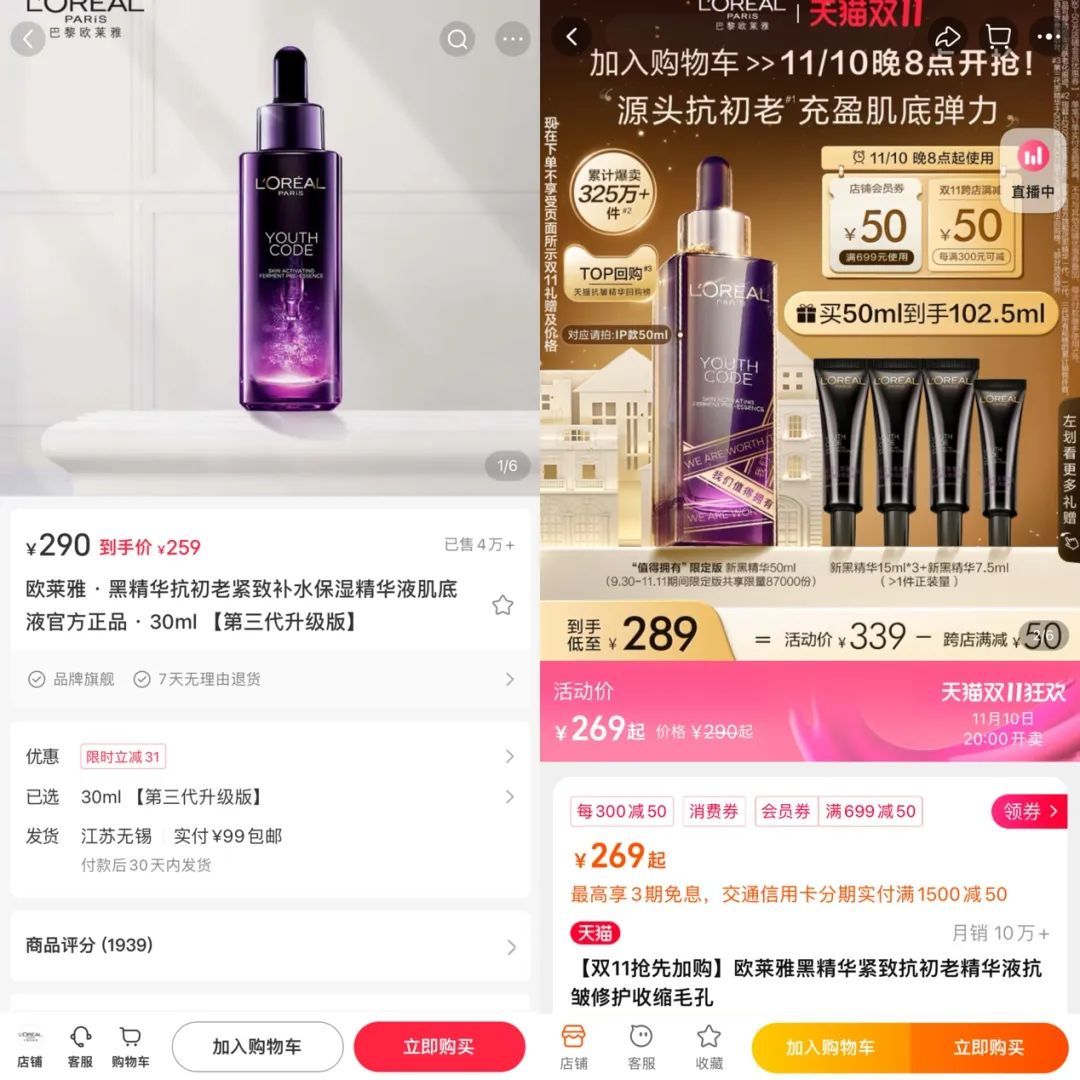 部分以官方旗舰店形式入驻小红书的品牌如欧莱雅,在价格上并没有显著优势。以某款欧莱雅精华液为例,在不包含赠品的情况下,小红书每毫升活动价高于天猫2.85元。
