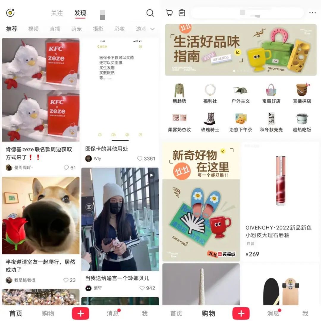除了一些App开屏广告之外,小红书双十一大促相关内容都集中在“购物”频道,在默认进入的“首页”频道中踪迹寥寥,用户很难在“首页”频道感知到小红书双十一的大促气息。