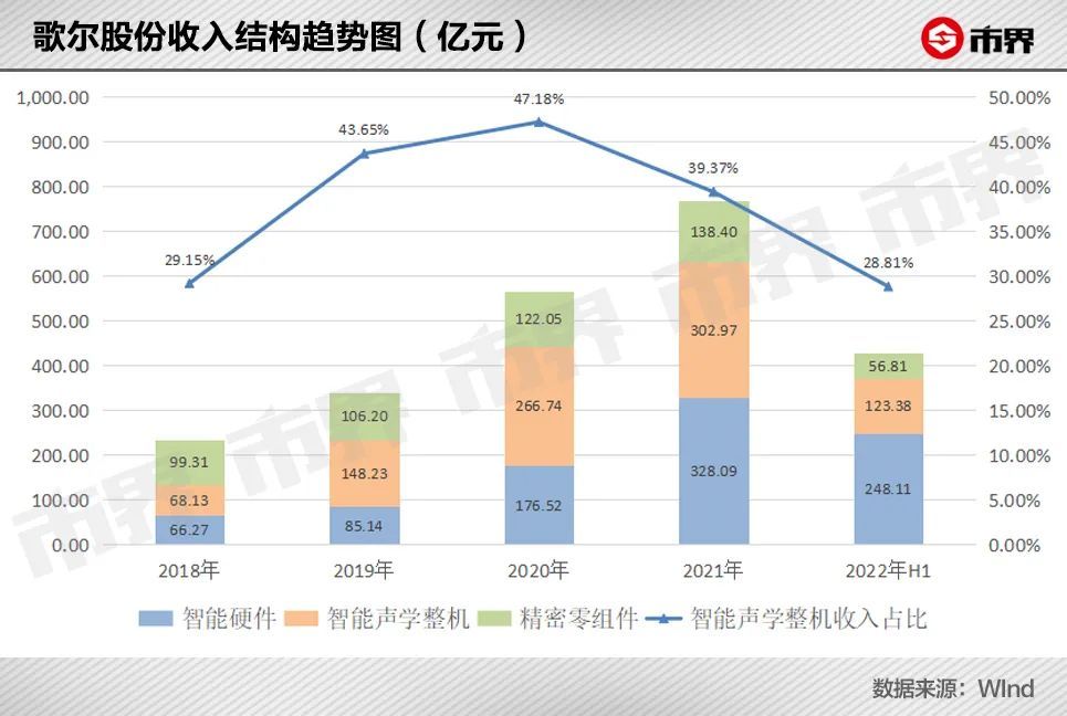 在这个过程中,歌尔股份的收入结构,事实上发生了一个明显改变——2018年到2022年上半年,其收入贡献由大到小的业务排序,从原来的精密零组件(41.81%)、智能声学整机(28.68%)和智能硬件(27.9%),调转了一个顺序,变为了智能硬件(56.9%)、智能声学整机(28.3%)和精密零组件(13.03%)。