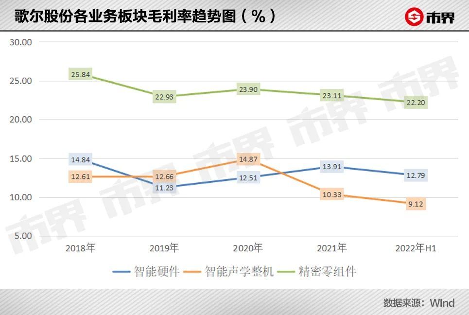 从报表显示的毛利率来看,歌尔股份智能声学整机业务的毛利率一直处于较低水平,2021年和2022年上半年还在不断下降,最新数据低至9.12%。