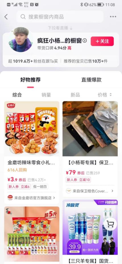 在选品方面,小杨哥的产品货单价基本在100元以下,符合他账号的受众画像,打开小杨哥的好物橱窗,会发现里面有小零食、日常百货、美妆等产品。