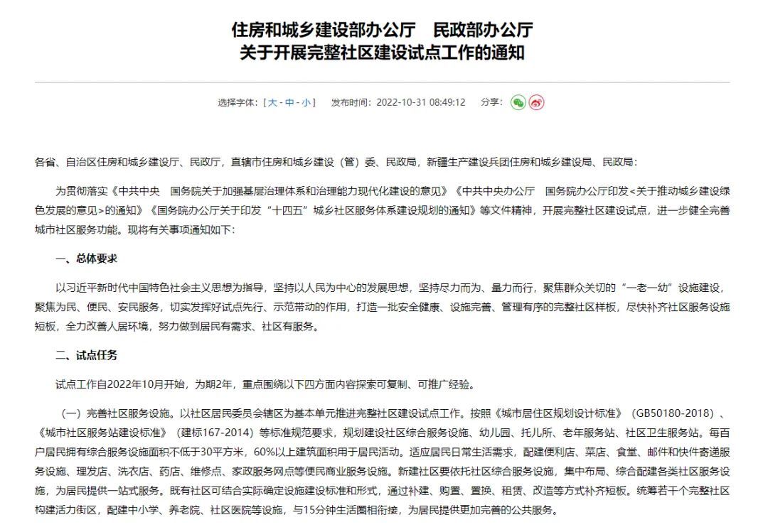 10月底,住建部、民政部联合发布《关于开展完整社区建设试点工作的通知》,提出各市区应选取3至5个社区开展完整社区建设试点,试点社区应规划建设社区综合服务设施、幼儿园、老年服务站、食堂等系列便民商业服务设施,试点时间自2022年10月开始,为期2年。