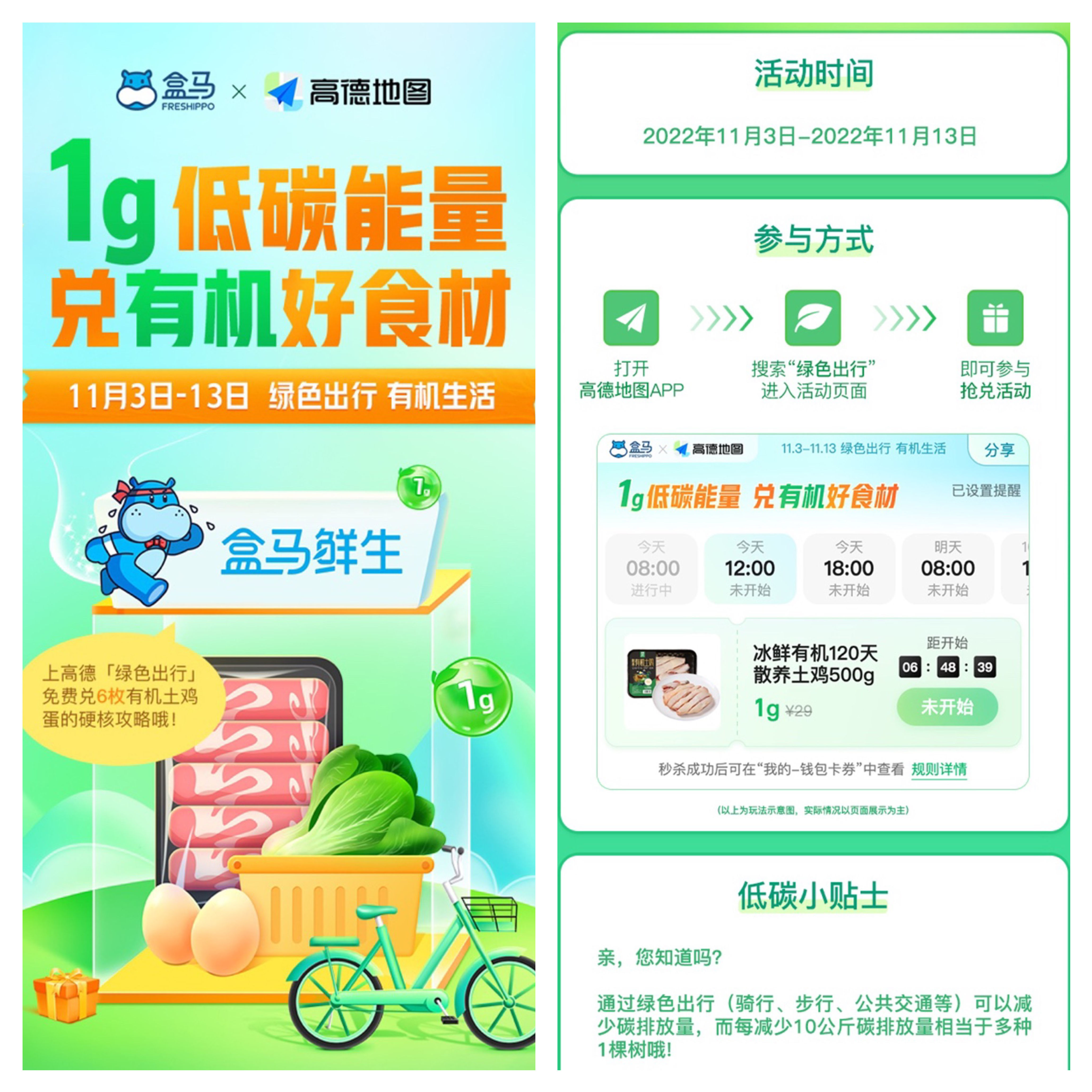不同平台间的跨界活动,也串联起用户的日常生活。双11期间,高德地图联合盒马,推出“绿色出行+有机生活”行动,目前已在国内多个城市上线。用户在高德地图APP上使用公交、骑行、步行导航等绿色出行相关服务,便可收集相应的碳能量,并通过“绿色出行-碳普惠”主页兑换由盒马提供的“0碳”有机农产品。