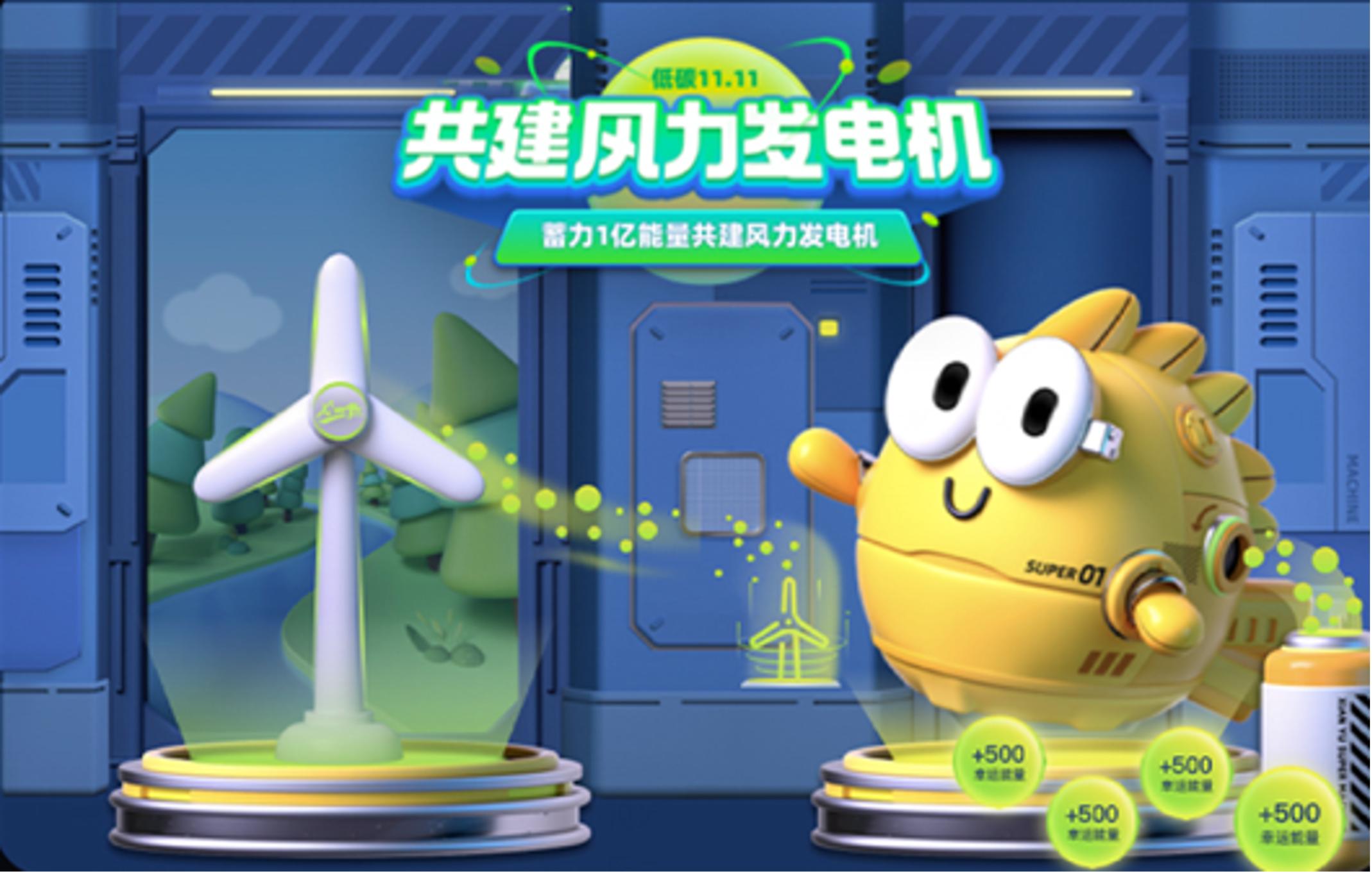 阿里巴巴旗下的闲置交易平台闲鱼,在今年开启第一届“闲鱼低碳双11”。此次活动中有个高光环节,用户参与闲置交易,完成任务并共同蓄力1亿能量后,能参与闲鱼和国家电投集团共建风力发电机的活动,并获得建设证书及勋章。