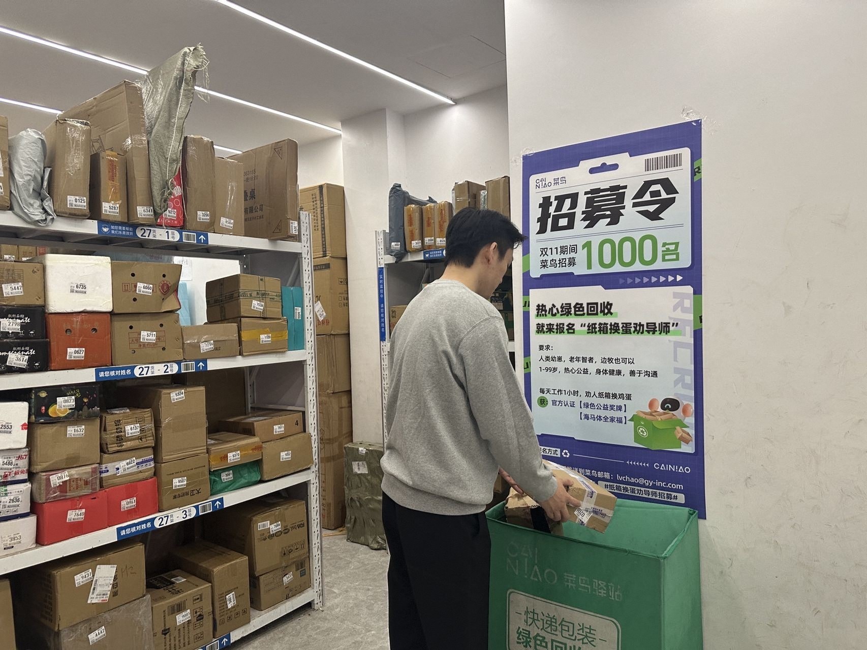 事实上,这是菜鸟物流在今年双11期间推出的一项绿色公益活动,消费者在菜鸟驿站取件之后留下快递包装,便可领取鸡蛋等绿色礼品,而被回收的快递包装盒,也将投入菜鸟物流的回收再利用行动。