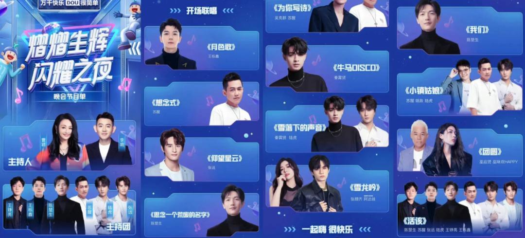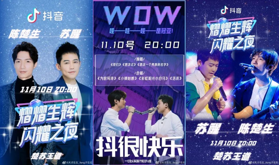 今年其实是抖音首次入局双11晚会,但平台对《熠熠生辉闪耀之夜》这个项目的资源投入并不多,节目单几乎围绕“再就业男团”进行排列组合,要么是陈楚生“独唱节目”,要么是陆虎和秦霄贤合唱《雪落下的声音》的“CP乱炖”,晚会摆明了就是要再榨取一波老快男们快要流失的热度。