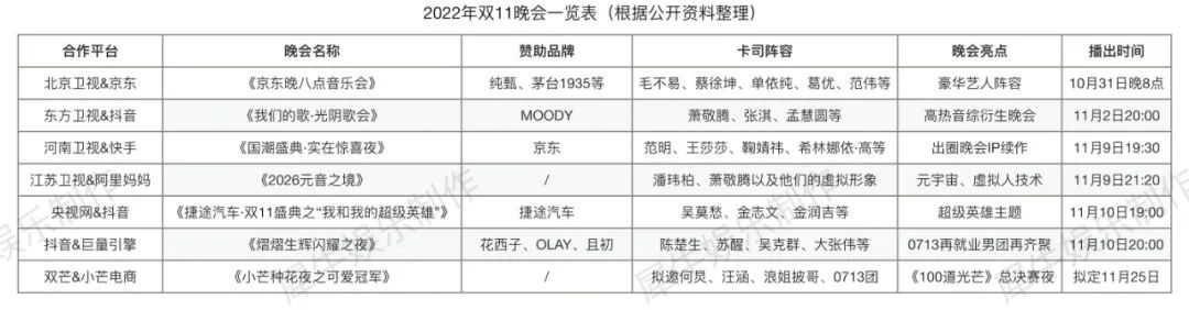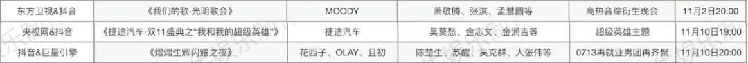 双11前夕,江苏卫视《2026元音之境》与河南卫视《国潮盛典·实在惊喜夜》在9号同夜对打,抖音《熠熠生辉闪耀之夜》与央视网品牌定制晚会《捷途汽车·双11盛典》在10号同天开跑,可几台晚会略显穷酸的卡司阵容实难撑起场面。(见下表)