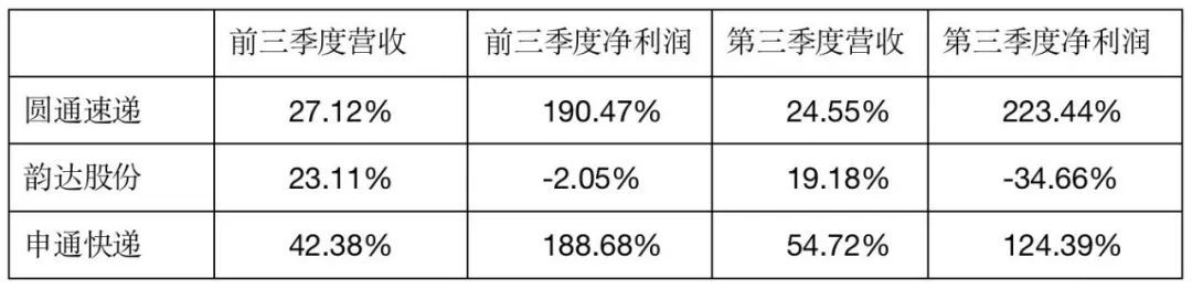 如果仅从绝对值上看,无论是第三季度还是前三季度,无论是营收还是净利润,由大到小排序均为圆通速递、韵达股份、申通快递。但从增速上看,圆通速递和申通快递仍然保持了上半年的高增速,但韵达股份第三季度净利润增速却大幅下滑,以致于令前三季度的净利润也同比降2.05%。