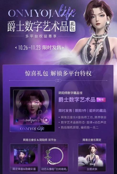 只是出游戏相关音乐很难带来实际的收益,但如果能戳中玩家群体的偏好,乐于为游戏消费的玩家同样也可能为相关的音乐内容消费。以与《阴阳师》的联动为例,是以爵士音乐为主题,为游戏内式神阎魔打造了酒吧主理人身份,从而更顺畅地推出包含音乐、可收藏艺术品、游戏皮肤、头像等多个权益的礼包。