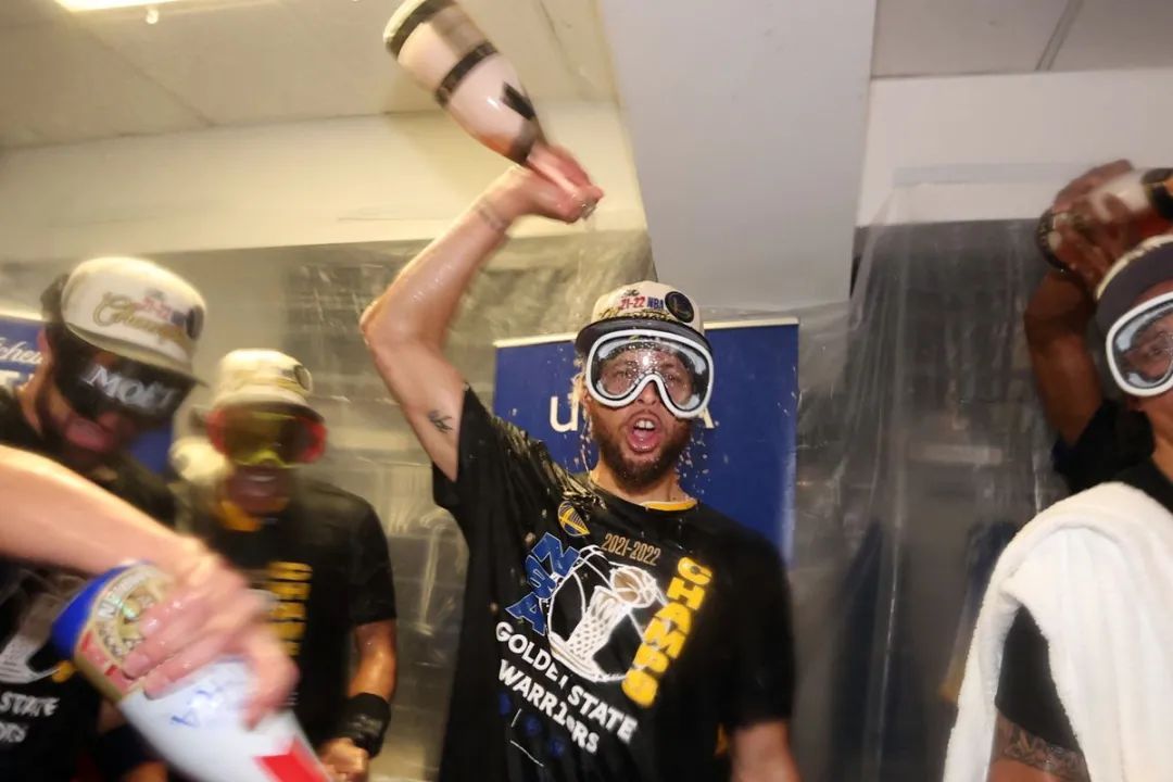 但对于大球类肢体对抗性强、动作幅度大的运动,往往对眼部配件有着「防滑、防碎、防戳」的需求。戴着护目镜在更衣室开庆祝香槟也成为了一个固定节目,为庆祝NBA75周年,NBA官方也与LV合作推出了定制金色的「胜利护目镜」。